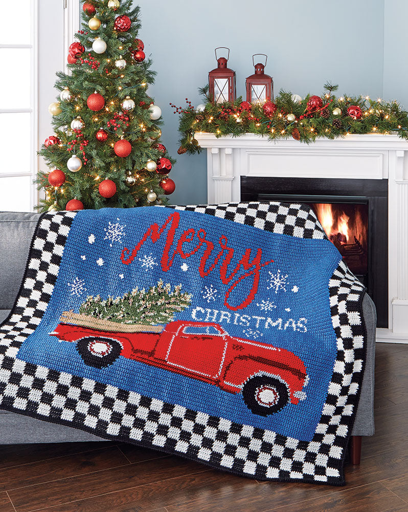 The Mary Maxim Merry Christmas Afghan depicts coming home from the tree farm with the perfect tree! Kit to crochet includes Mary Maxim Starlette yarn. This lovely afghan will look stunning placed over the couch or as your favorite blanket to snuggle under while watching your favorite Christmas Movie.