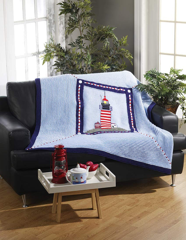 Create a cozy throw featuring the iconic West Quoddy Head Lighthouse, a beloved historic landmark in Maine, beautifully showcased in the central panel. This pattern is designed for use with Mary Maxim’s popular worsted weight yarn, Starlette, which provides 180 yards per 3.5 oz skein. Explore our wide range of worsted yarns, including Starlette, to find the perfect match for your project—just be sure to check yardage as it may vary. Bring a touch of coastal charm to your home with this unique crochet afghan. Materials Listed: Lt Blue (13 balls), Dk Blue (3 balls), White, Red, and Green (1 ball each), Black, Yellow, Rose, and Denim Blue (35 yds each), beads, and crochet hooks size I/9 (5 mm) and afghan hook size H/8 (5 mm). Finished size 49.5 x 54" (125.5 x 137 cm)—Intermediate crochet.