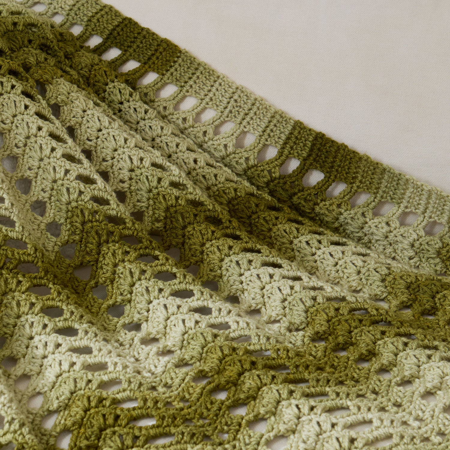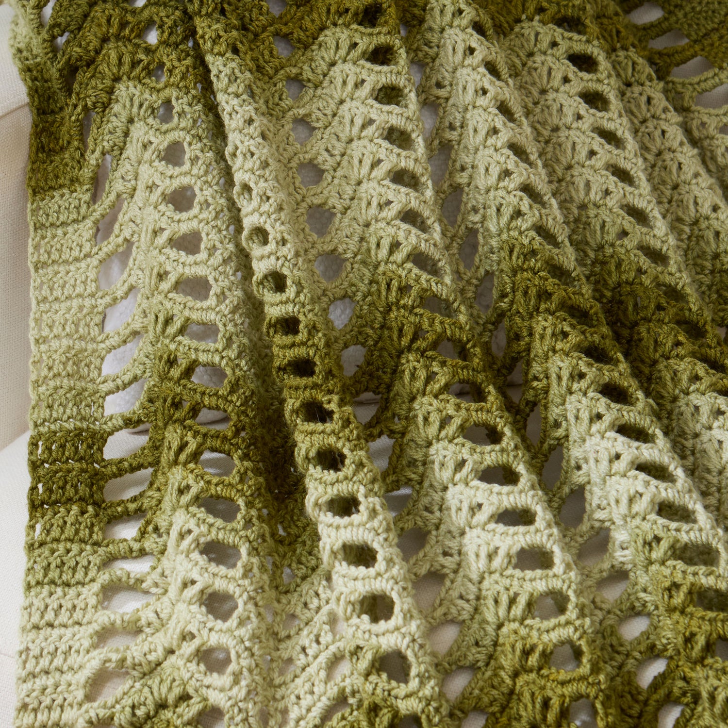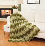 This open-work ripple is enhanced by a stunning display of colors. Kit includes Bag-O-Day Tonal Hues yarn and pattern. Requires crochet hook I-9. Size 46 x 57". Intermediate Crochet.