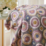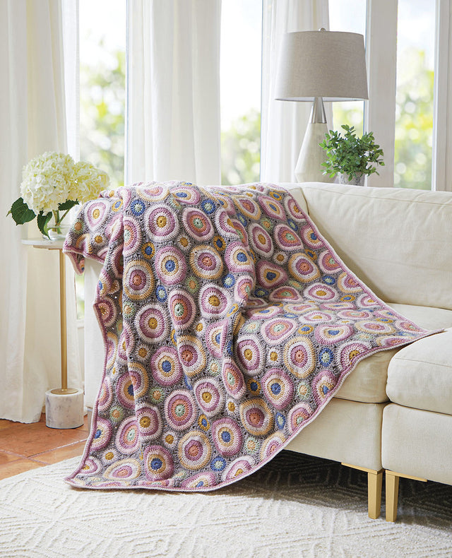 Designed by Janie Crow. A stunning display of soft, relaxing colors in circular motifs that are joined together. Kit includes Mary Maxim Mellowspun DK yarn and pattern. Requires crochet hooks E-4 (3.5 mm) and G-6 (4 mm). Size 46.5" x 46.5". Skill level: advanced crochet.