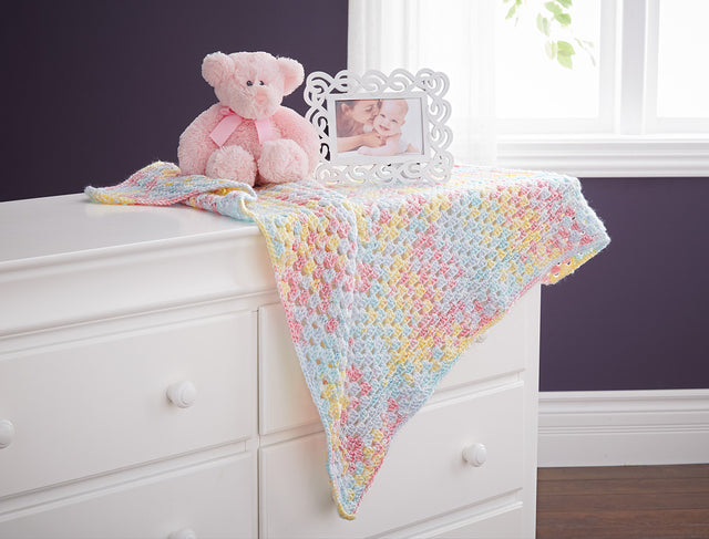 Soft pastel colors revolve around this basic granny square. Kit includes Mary Maxim Baby Value worsted weight yarn and pattern. Finished Size approximately 36” [91.5 cm] square. Requires Crochet Hook Size H-8 (5.00 mm)