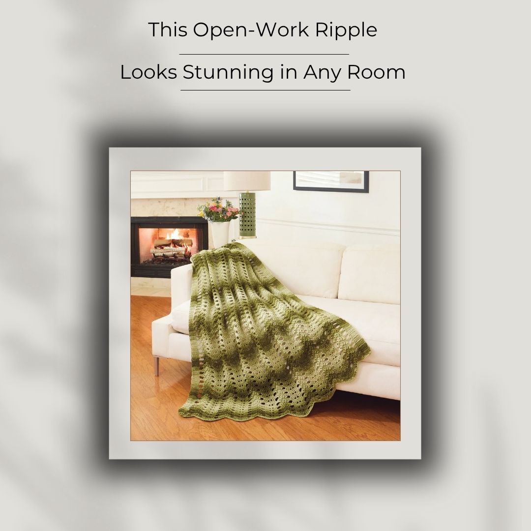 This open-work ripple is enhanced by a stunning display of colors. Kit includes Bag-O-Day Tonal Hues yarn and pattern. Requires crochet hook I-9. Size 46 x 57". Intermediate Crochet.