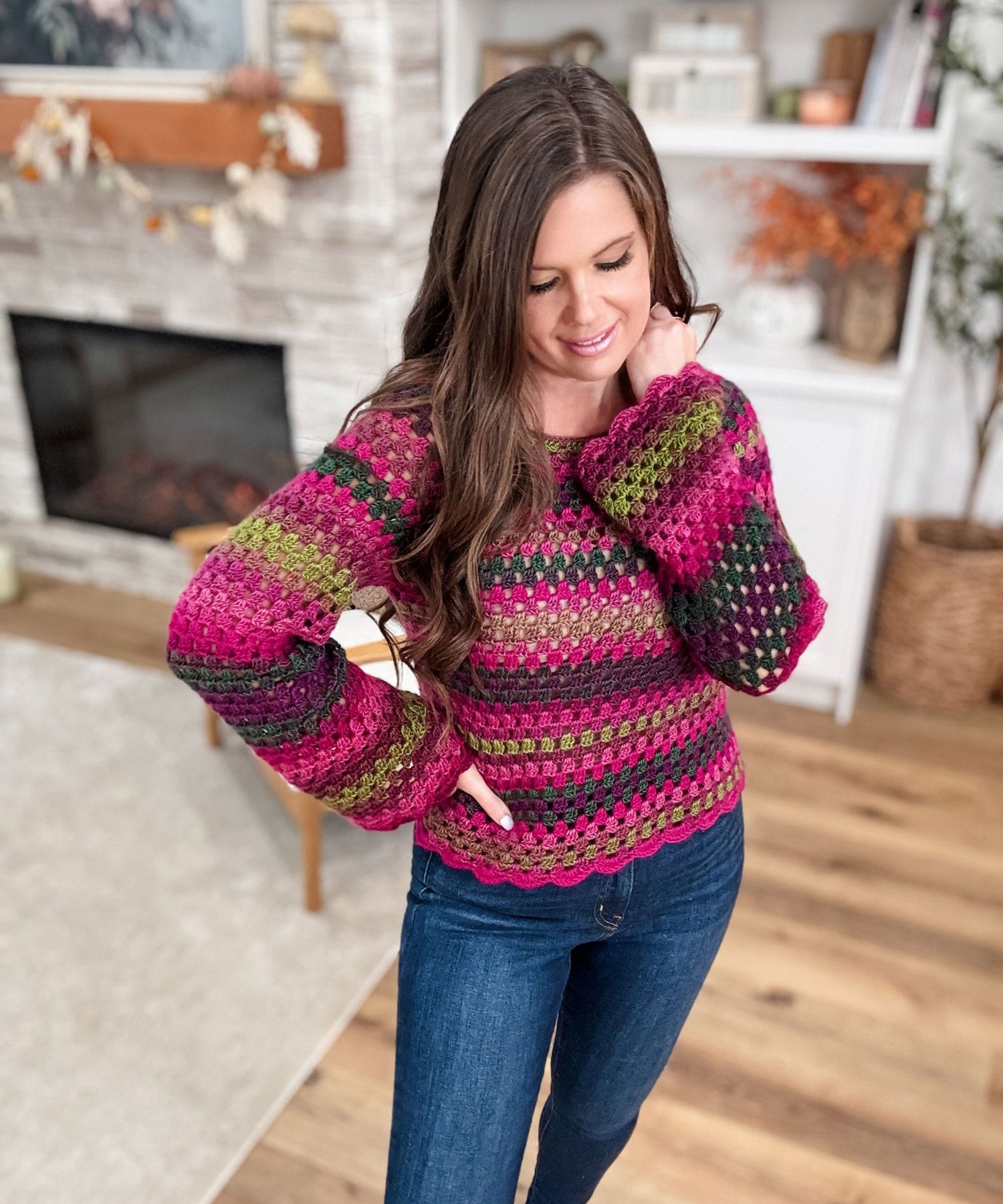 Designed by MJ's Off The Hook. Worked seamlessly from top down in the round, this sweater features long sleeves finished with shell stitch cuffs. Kit includes Mary Maxim Prism yarn and pattern. Requires crochet hooks G-6 and size 7. Intermediate Crochet.