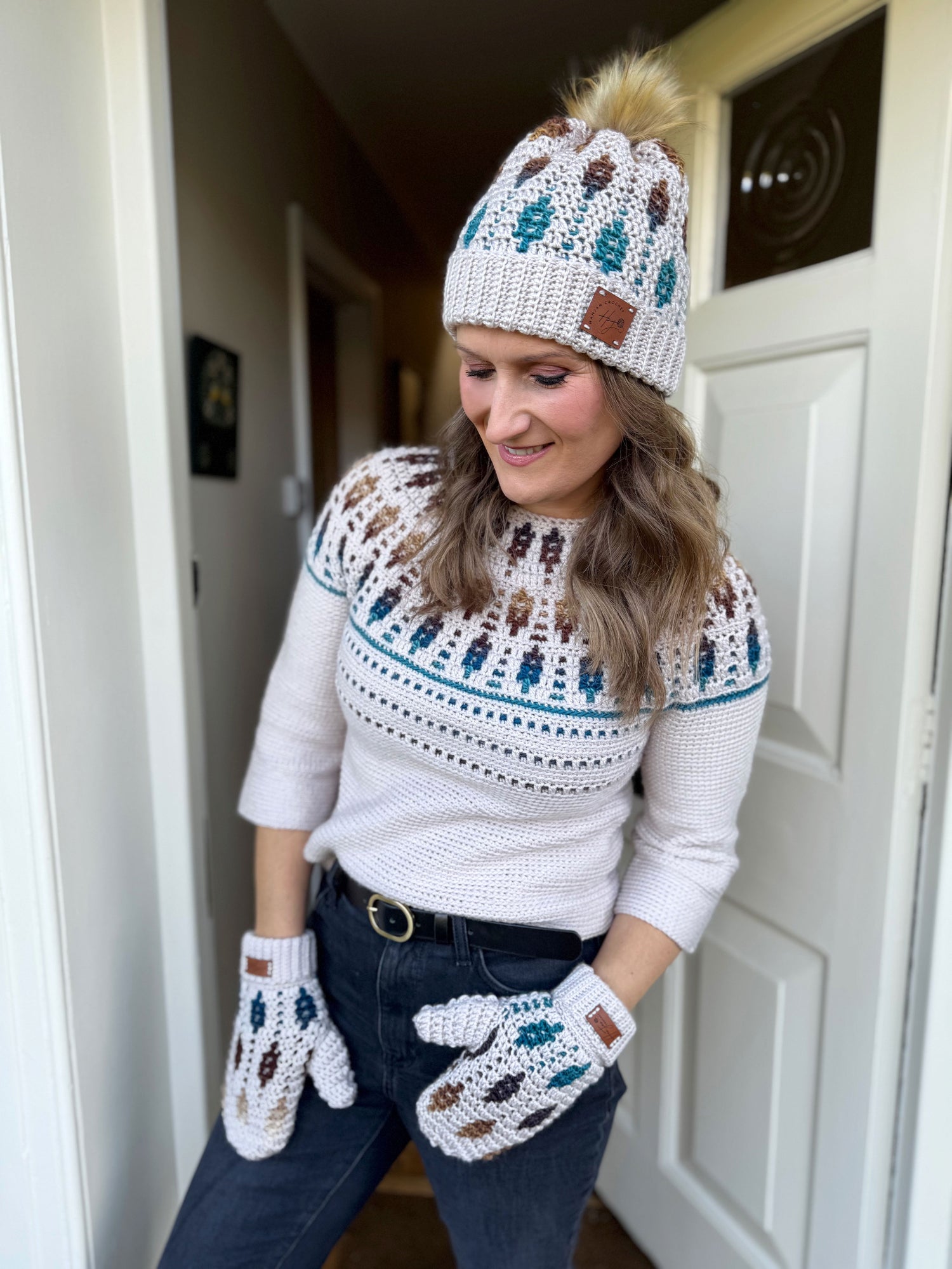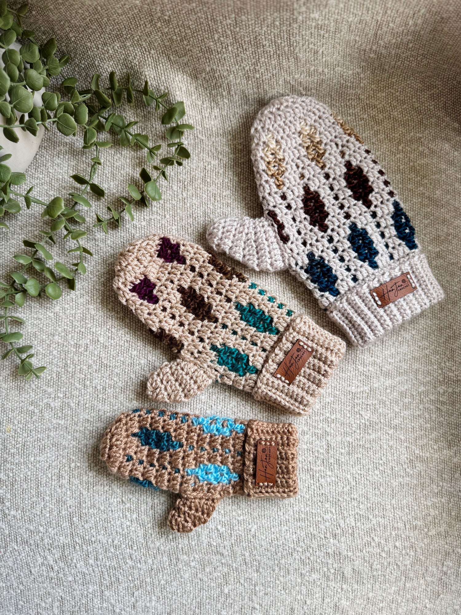 Designed by HanJan Crochet. Create these stunning mosaic mittens, worked from the cuff upwards using one color per round. Kit includes Mary Maxim Mellowspun DK yarn, Mary Maxim Prism yarn and pattern. Requires crochet hooks G-6 and size 7. Sizes toddler to adult. Intermediate Crochet.
