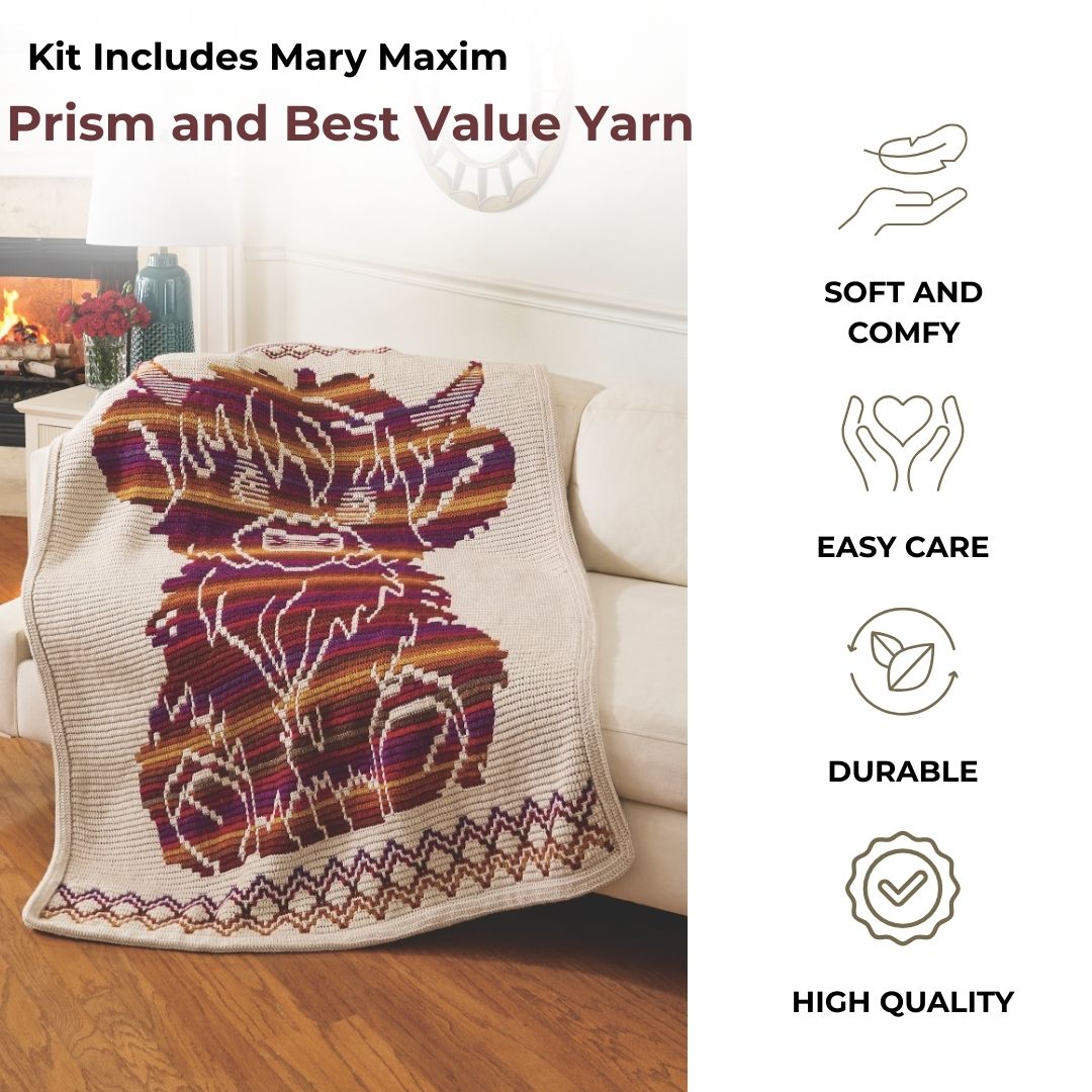 Bring the charm of the Scottish Highlands into your home with this delightful yet functional work of art. Kit includes Mary Maxim Prism yarn, Mary Maxim Best Value yarn and pattern. Requires crochet hook H-8. Size 42 x 62". Intermediate Crochet.