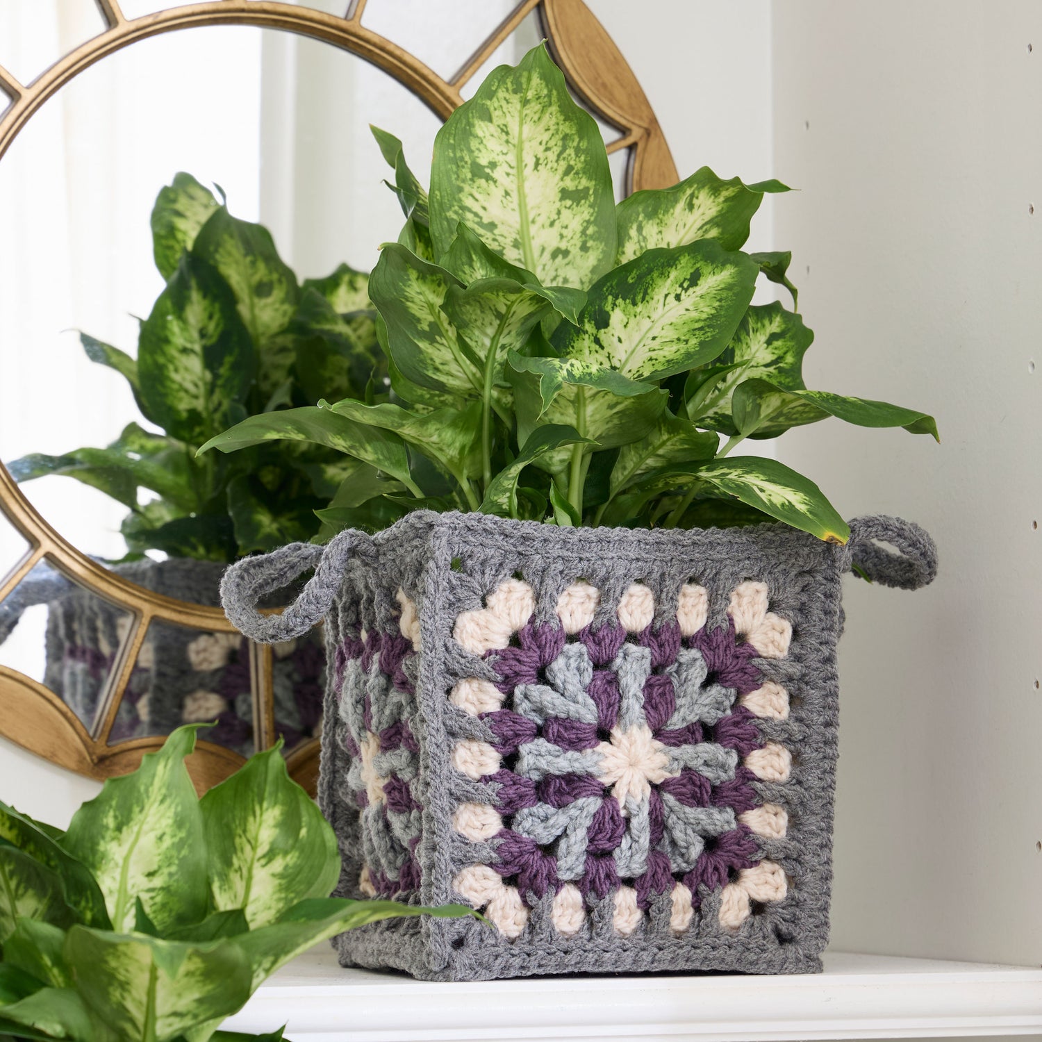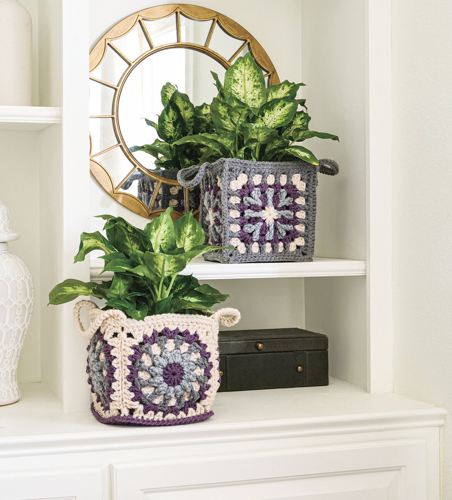 Modified granny squares create these timeless storage baskets. Kit includes Mary Maxim Titan yarn, Premier Basix Chunky yarn and pattern to make 2 baskets. Requires crochet hook K-10.5. Size 8 x 8 x 5". Easy Crochet.