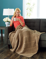 Measuring a cushy 50" square, the Quick & Cozy Blanket allows for a loved one to curl up under it and stay toasty warm now and throughout the years. As a bulky weight yarn, Mary Maxim Titan yarn gives beautiful definition to the simple stitch patterns in this blanket and using it shows off the wonderful yarn as well as the stitches.