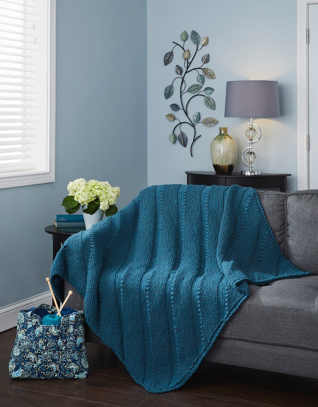 The Quick & Cozy Blanket is worked diagonally from corner to corner, easily taking the knitter from a garter stitch pattern through a stocking stitch pattern and through an eyelet stitch pattern, a sequence repeated from beginning to end, all while working increases along the edge during the first half and decreases along the edges during the second half.