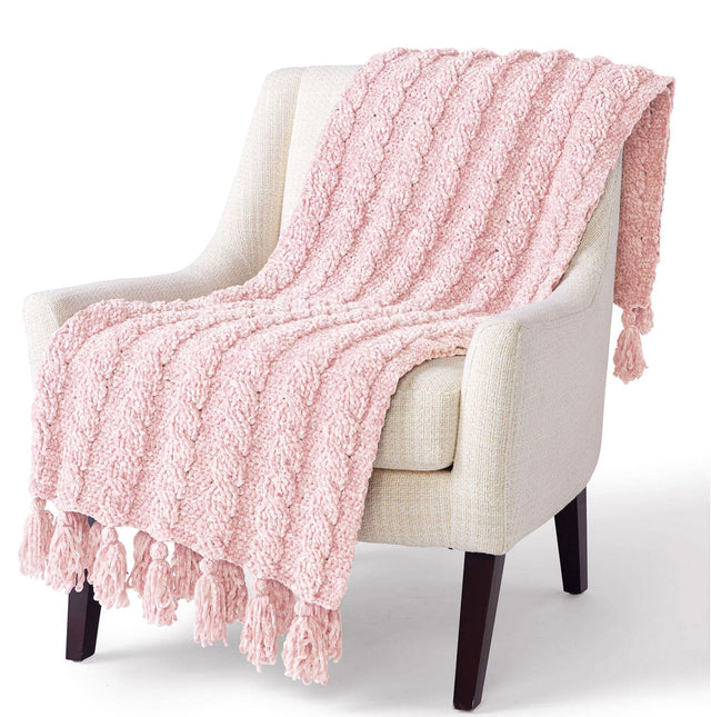 A super soft and cozy blanket. Kit includes Bernat Velvet yarn and pattern. Requires crochet hook I-9. Size 48 x 60". Intermediate Crochet. Shown in color no longer available.