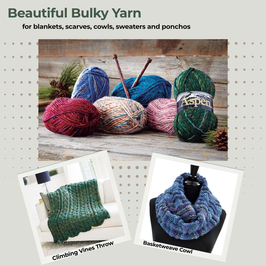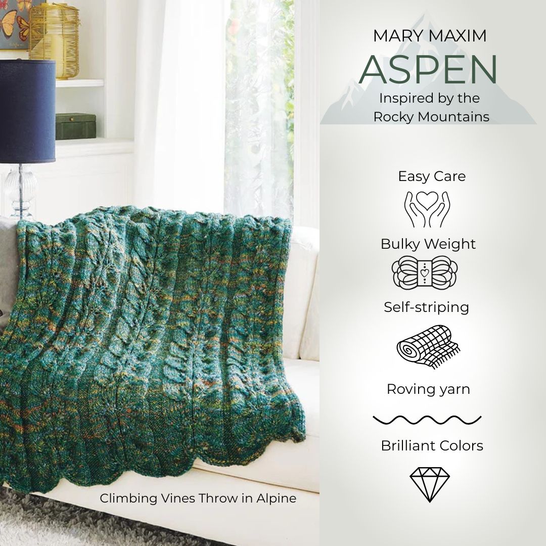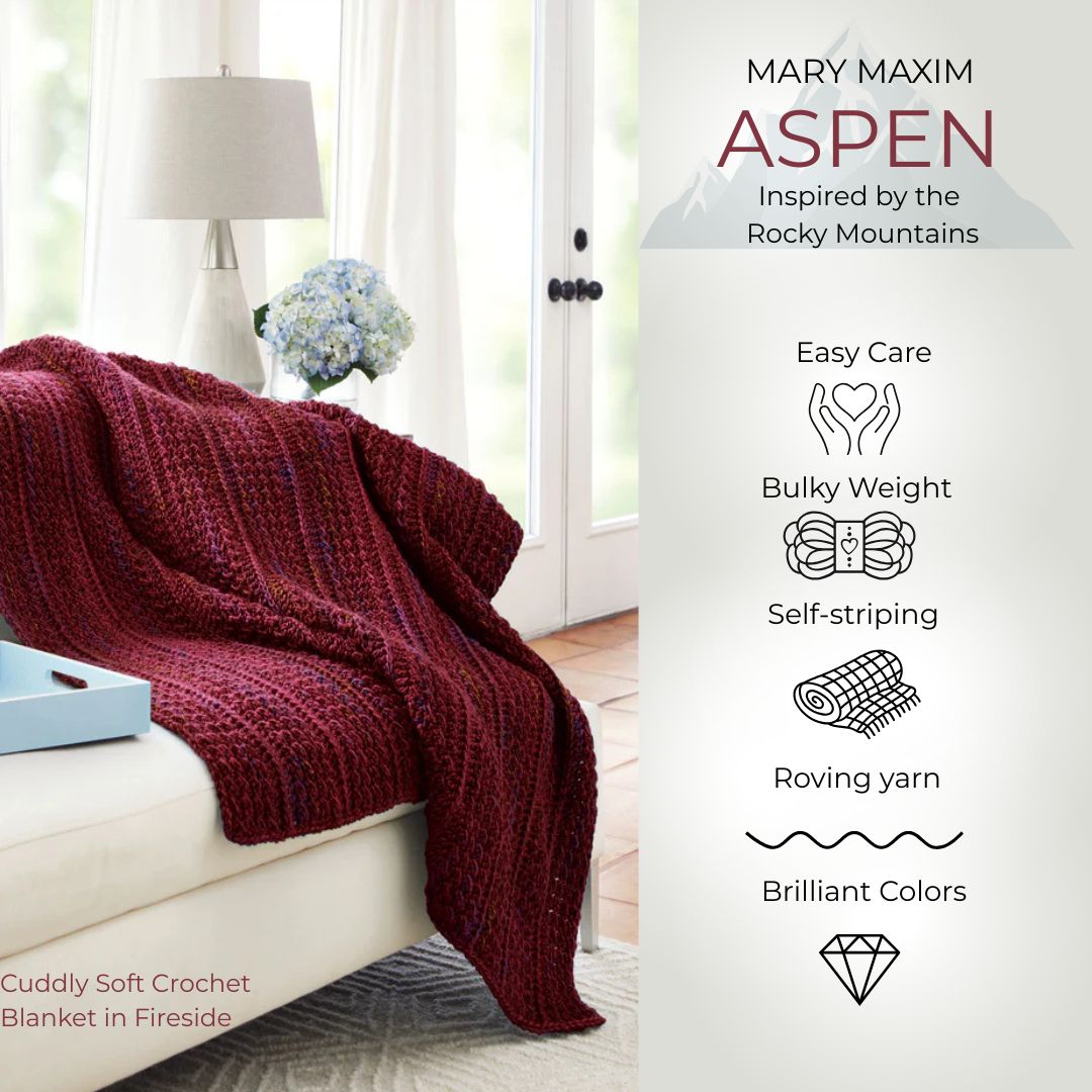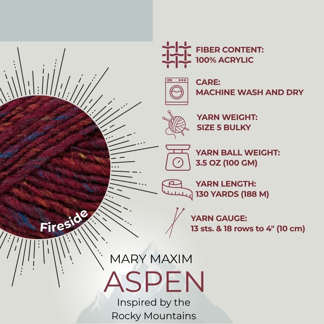 Mary Maxim Aspen yarn is a delightful bulky weight roving yarn inspired by the Rocky Mountain Landscapes. Mary Maxim Aspen is a soft and lofty yarn making it easy to create to your heart's content.