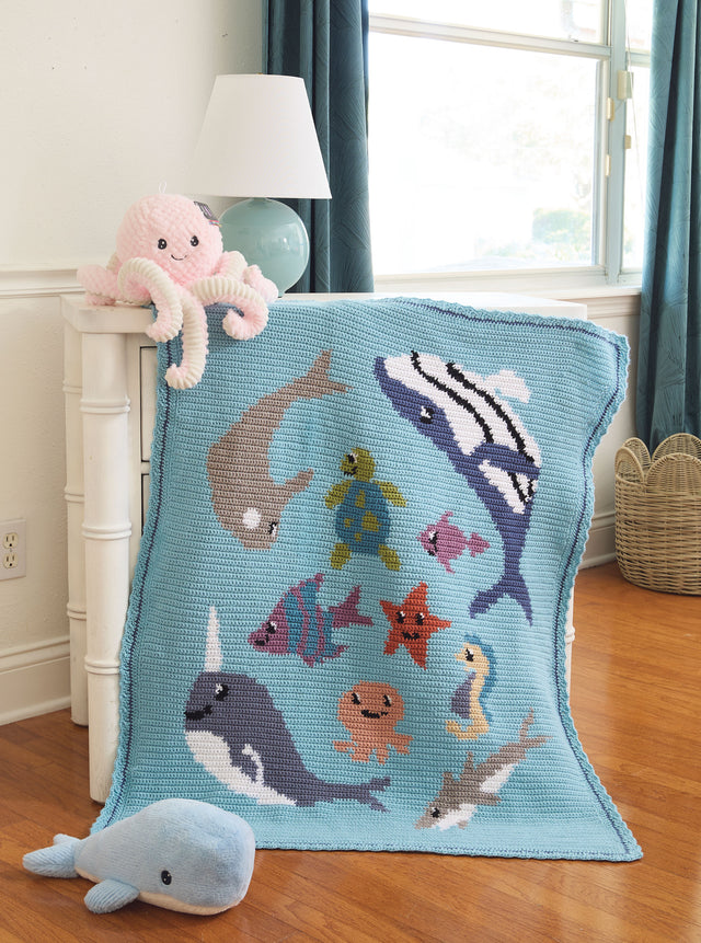 Designed by Sanika Udar. This charted crochet blanket will transform your nursery into a peaceful aquatic haven. Kit includes Mary Maxim Mellowspun DK yarn and pattern. Require crochet hook size 7. Size 32 x 38". Intermediate Crochet.