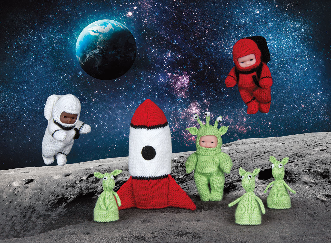 Out of this world adventures await for your young astronaut! Pattern includes instructions to make alien suit, baby aliens, white astronaut suit, red astronaut suit, and rocket. Designed using Mary Maxim Twinkle fingering weight yarn that provided 230 yds per 1.75 oz skein. Materials List: White, Leaf, Black, Cardinal (1 ball ea), knitting needles Size 2, double point needles size 2 and stitch markers. Also, White buttons (4), Red Buttons (4), Black Buttons (2), Black Felt, 5" Lots of Love Dolls, Polyfill. Fits 5" Dolls—Intermediate knit.