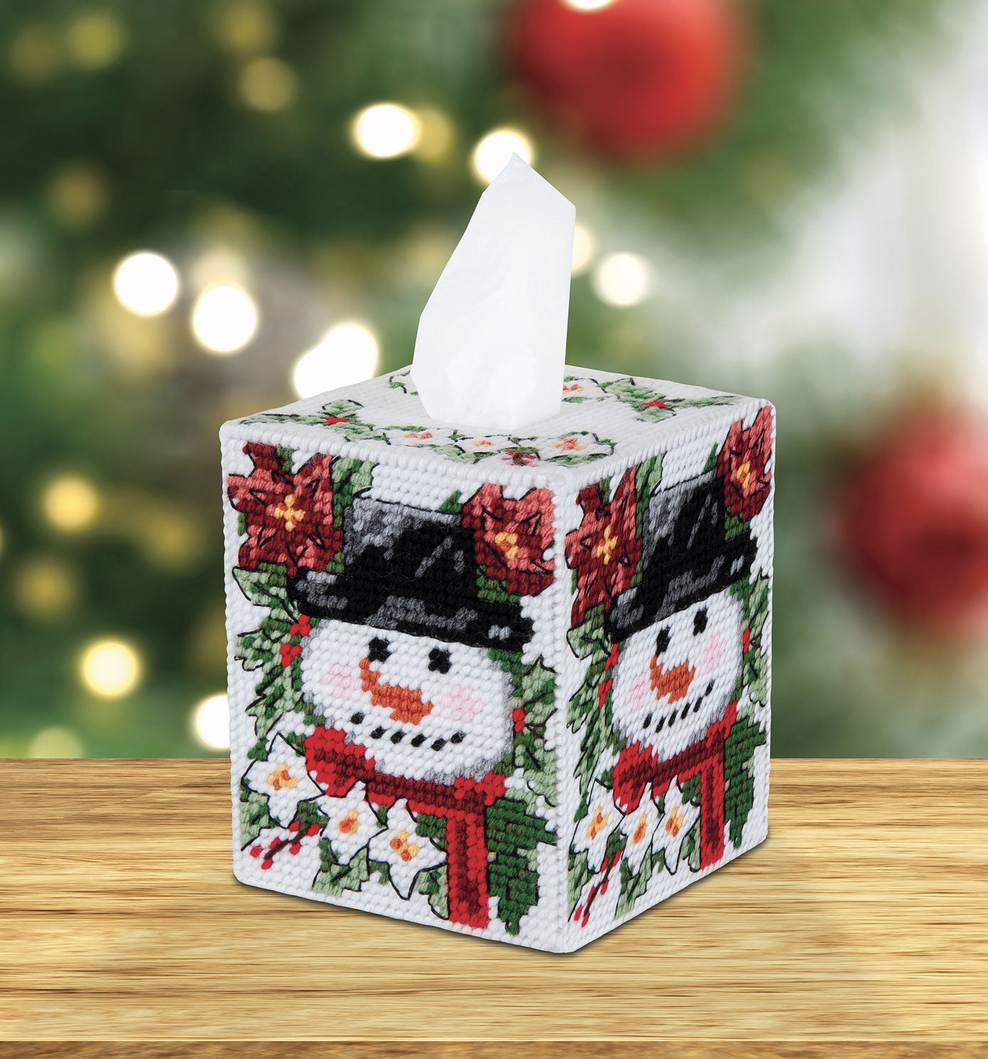 Designed by Tiger Road Crafts. Welcome the holidays with this cute tissue box cover. Kit includes 7 mesh plastic canvas, acrylic yarn and pattern to fit boutique size tissue box.