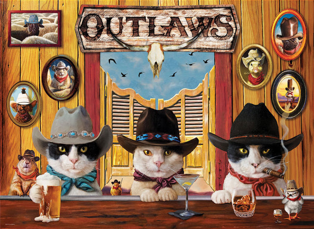 Saddle up for a rootin' tootin' good time with this whimsical 500-piece jigsaw puzzle! Watch three mischievous cats in classic cowboy hats belly up to the bar in a dusty saloon setting. With oversized puzzle pieces measuring 26.5 x 19.25 inches, this fun-filled frontier scene is perfect for puzzle enthusiasts who love a little humor and Wild West charm. Ideal for family game nights or solo adventures, this puzzle delivers laughs and satisfying assembly from start to finish.