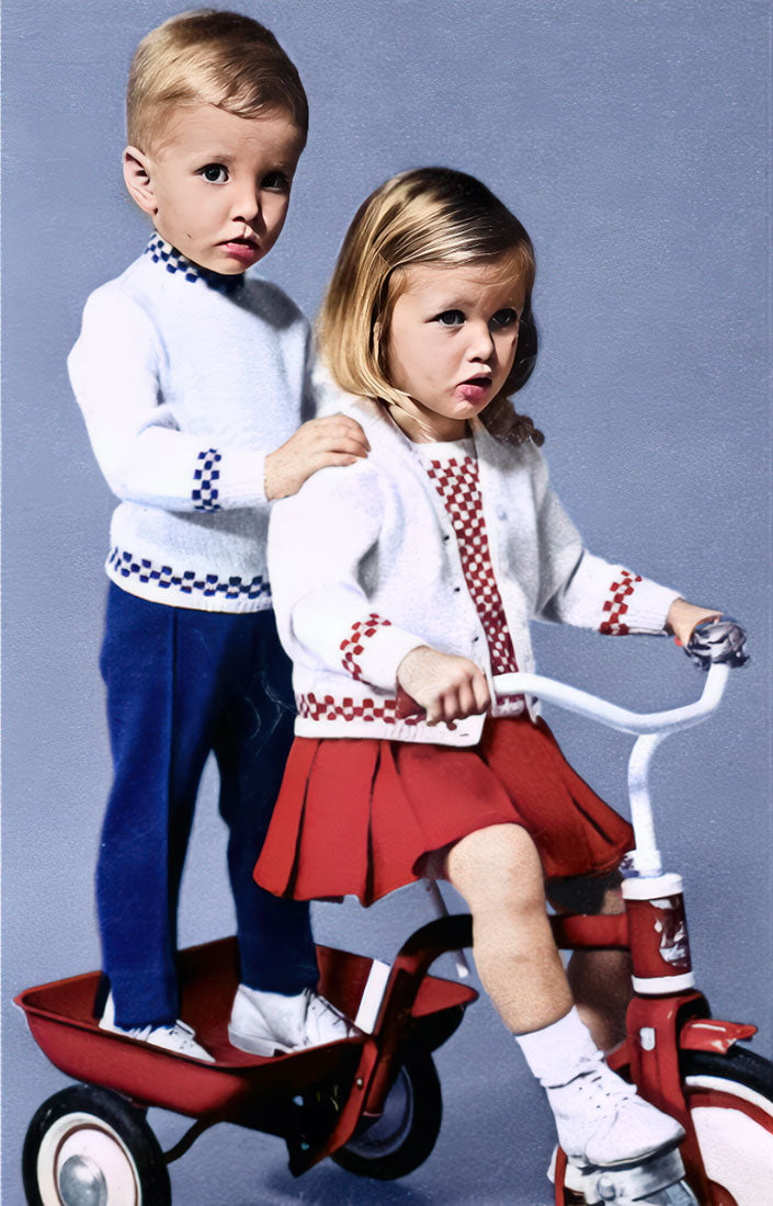 Create an adorable matching sweater set with our timeless Mary Maxim pattern. Choose between a long-sleeved turtle neck pullover, a cardigan, or a sleeveless shell with a charming checkered design. Originally created with Mary Maxim Mellowspun, a sport-weight yarn, that offered 210 yards per 2 oz skein at that time. With the wide variety of sport-weight yarns available today, including Mary Maxim Mellowspun, the options are endless. Keep in mind yardage varies. Materials List: Cardigan MC 8 oz, CC 2 oz. - Shell MC 6 oz, CC 4 oz. - Pullover MC 8 oz. CC 2 oz. Requires knitting needles size U. S. 4 (3.5 mm) 6 (4 mm) and 8" double point size 4 (3.5 mm). Fits sizes 2-4-3-6—Intermediate knit.