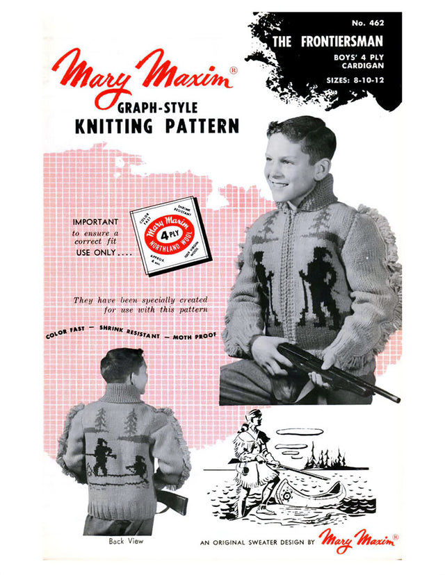 Create your own custom cardigan with our original frontier-inspired design, using our fun, easy-to-read graph pattern! This original design was created using Mary Maxim Northland yarn, which had 80 yds per skein at that time. But now, with a larger variety of bulky yarns to choose from, you can customize this project to match your unique style. Keep in mind that yardage may differ. Material List: Sz 8 MC (5 skeins), Sz 10 (6 skeins), Sz 12 (7 skeins). All sizes: Frontiersman (1 skein), Trees (1 skein). All you need are U.S. sizes 6 (4 mm) and 9 (5.5 mm) needles to begin! Fits children sizes 8-10-12—Intermediate knit.