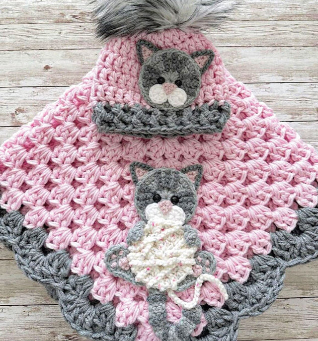 Designed by Nella's Cottage. Double stranded blanket and hat embellishment with playful cat appliques. Kit includes Mary Maxim Starlette yarn, safety eyes and pattern. Requires crochet hooks size 7 and M-13. Pom pom not included. Blanket size 32 x 32". Hat size 3 months. Intermediate Crochet.