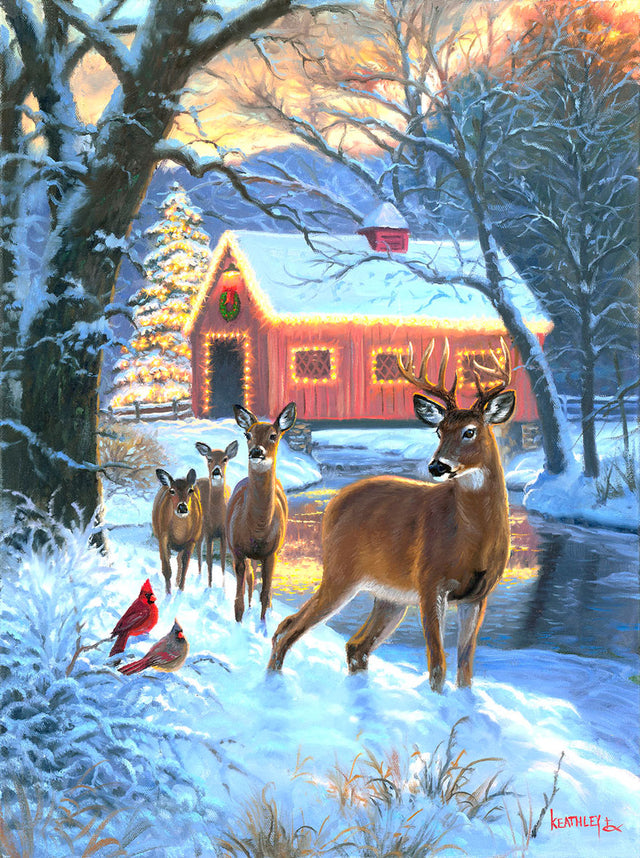 Experience the warmth of winter with the Greeting the Season Jigsaw Puzzle. This 500-piece puzzle features a charming family of deer wandering through snowy fields, captivated by vibrant cardinals, with a classic red barn nestled in the background. Measuring 18 x 24 inches, it offers the perfect challenge for puzzle lovers while bringing a cozy, festive scene to life. Delight in every piece as you create a serene winter landscape that's perfect for holiday gatherings or quiet evenings at home. Embrace the season’s beauty one piece at a time.