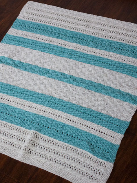 Designed by Ewe Ewe Yarns. This soft, squishy baby blanket features easy to remember stitch patterns. Kit includes Premier Everyday DK yarn and pattern. Requires 32" circ. needle size 7. Size 30 x 42". Easy Knit.