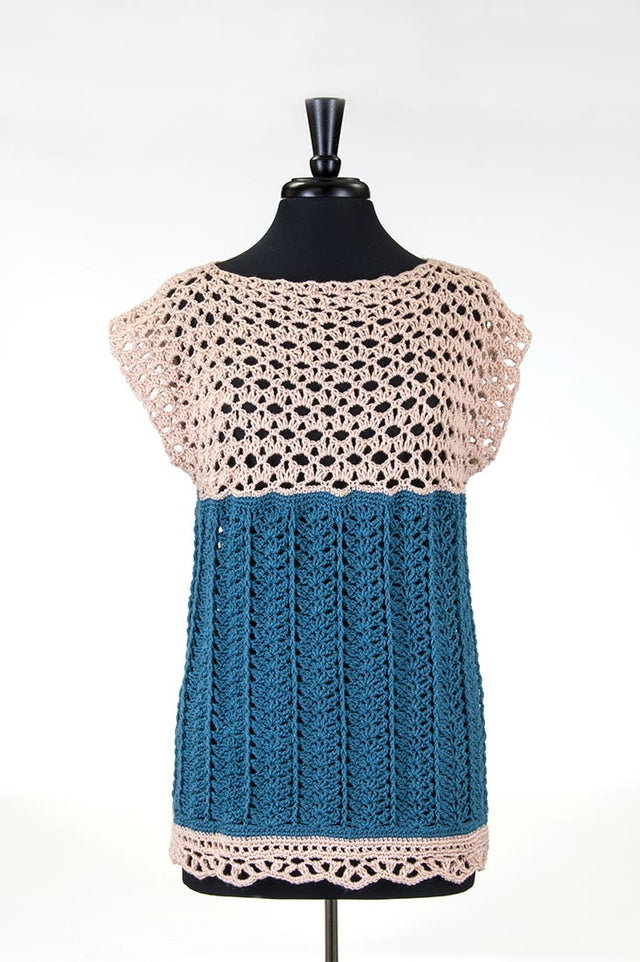 With this exclusive pattern, crochet a lacy Beachside Sweater or cover-up. Designed for the Mary Maxim Crochet Club in 2017, using Croma by Oso Blanco, a #3 DK Sport-weight yarn that offered 437 yds per 3.5 oz skein. Materials List: Azure (4 skeins), Lt Tan (3 skeins), and crochet hook size G/6 (4 mm). Fits sizes X-Sm/Sm, Med, Lg, XL, 2XL, chest sizes 36 (40, 44, 48, 52)", length from back neck, 24 (25, 26, 26.5, 27)"—Intermediate crochet.