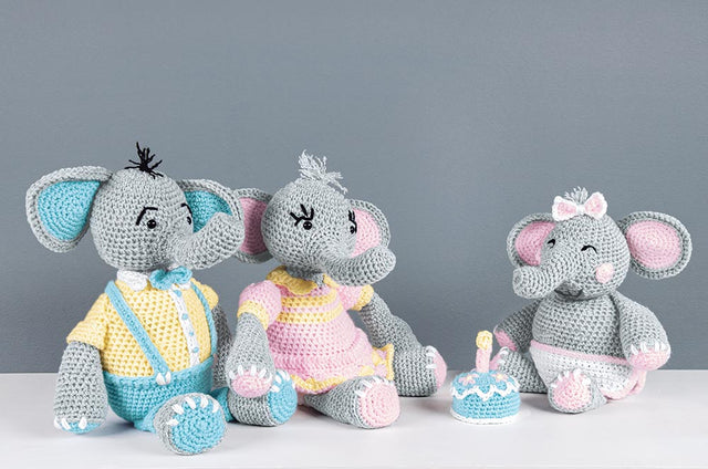 ¡Feliz cumpleaños maní! Eli y Ellie Elephant están ayudando a Baby Peanut a celebrar su primer cumpleaños. El kit incluye Mary Maxim Mellowspun DK y ojos de seguridad para hacer 3 elefantes y un pastel. Tamaño 8"-9,5" de alto. Se requiere Polyfill , se vende por separado. Requiere aguja de crochet F-5 (3,75 mm) y marcadores de puntadas . Ganchillo intermedio.