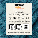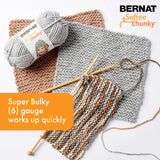 Bernat Softee Chunky Yarn es una fibra 100% acrílica completa y redonda de 6 capas que teje y hace crochet suavemente con las agujas y el ganchillo. El calibre voluminoso aumenta rápidamente con una excelente definición de puntada, creando un proyecto limpio y con un acabado profesional, ya sea que desees tejer una manta rápida y sencilla o una capucha moderna para el invierno. Desde neutros hasta brillantes, este hilo súper voluminoso está disponible en una gama de tonos sólidos y multicolores.