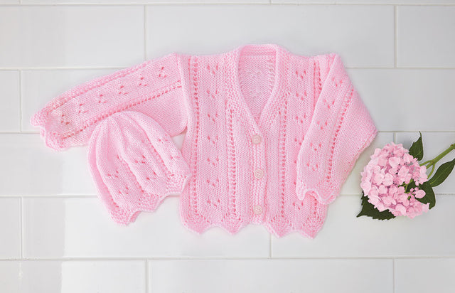 Teje este cárdigan y gorro con Mary Maxim Baby's Best Yarn . Los tamaños de 6 a 12 meses requieren 3 ovillos, los tamaños de 18 a 24 meses requieren 4 ovillos, agujas de tejer de tamaño 6 (4,00 mm) y agujas circulares de 32" de tamaño 6 (4,00 mm) .