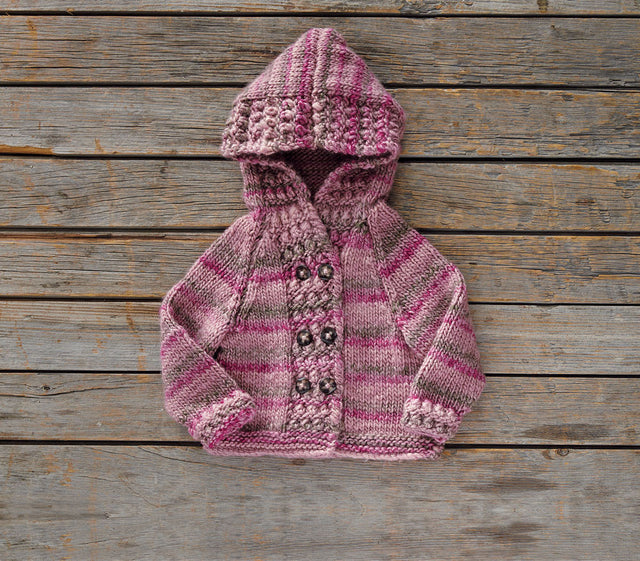 Cálida chaqueta con capucha y detalles de costuras que enmarcan el rostro en la capucha, el borde delantero y los puños. El kit para tejer incluye patrón y hilo voluminoso Mary Maxim Aspen #5. Requiere aguja de 24" de diámetro 10.5 y agujas rectas tamaño 10.5. Botones no incluidos.