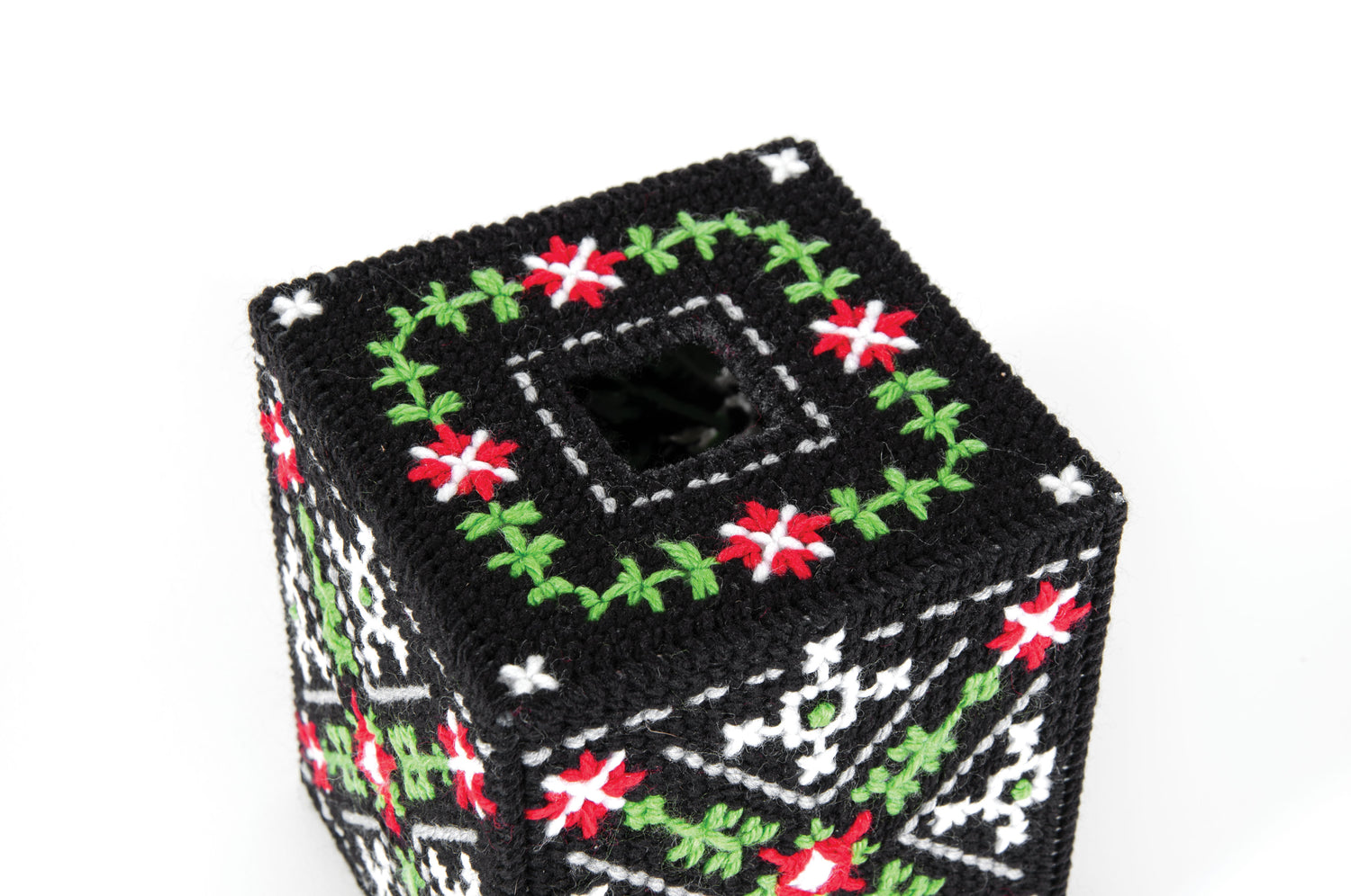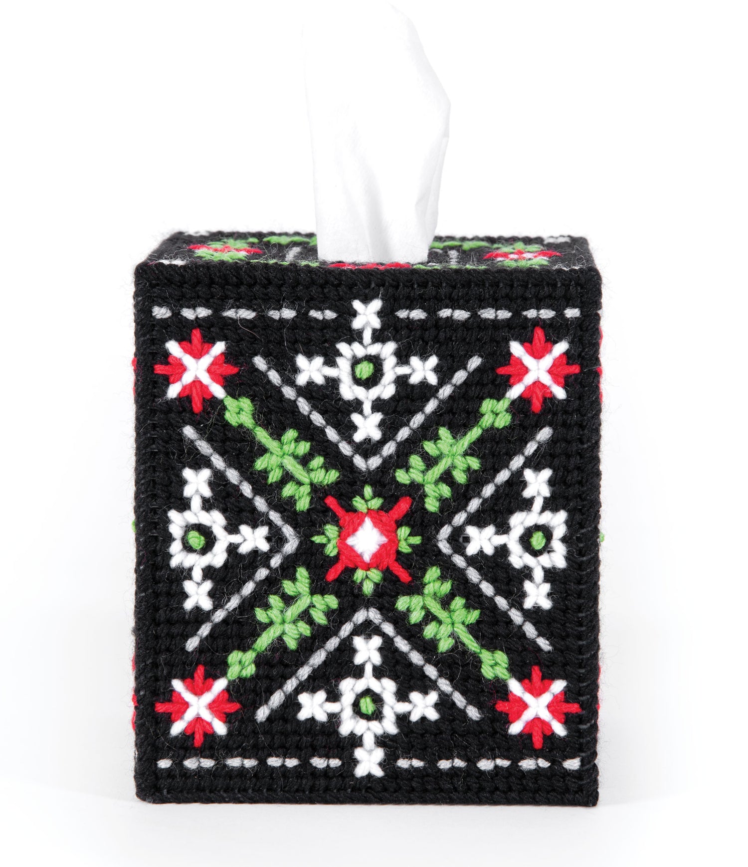 Designed by Tiger Road Crafts. Update your drab tissue box with this striking cover. Kit includes 7 mesh plastic canvas, acrylic yarn and pattern to fit a boutique size box.