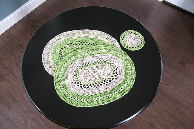 Bring some cheerful colors to your dining experience with this pattern! Designed for the 2019 Mary Maxim Crochet Club using DK sport-weight Dishcloth Cotton that offered 164 yds/3.5 oz skein. Shop our brands of cotton yarns to find the perfect combination for your table setting. Just keep in mind, yardages may vary. Materials List: White and Green 3 balls each, and crochet hook size G/6 (4 mm). Finished placemat 16 x 12" (40.5 x 30.5 cm). Coaster 5" (12.5 cm) diameter. Easy crochet.