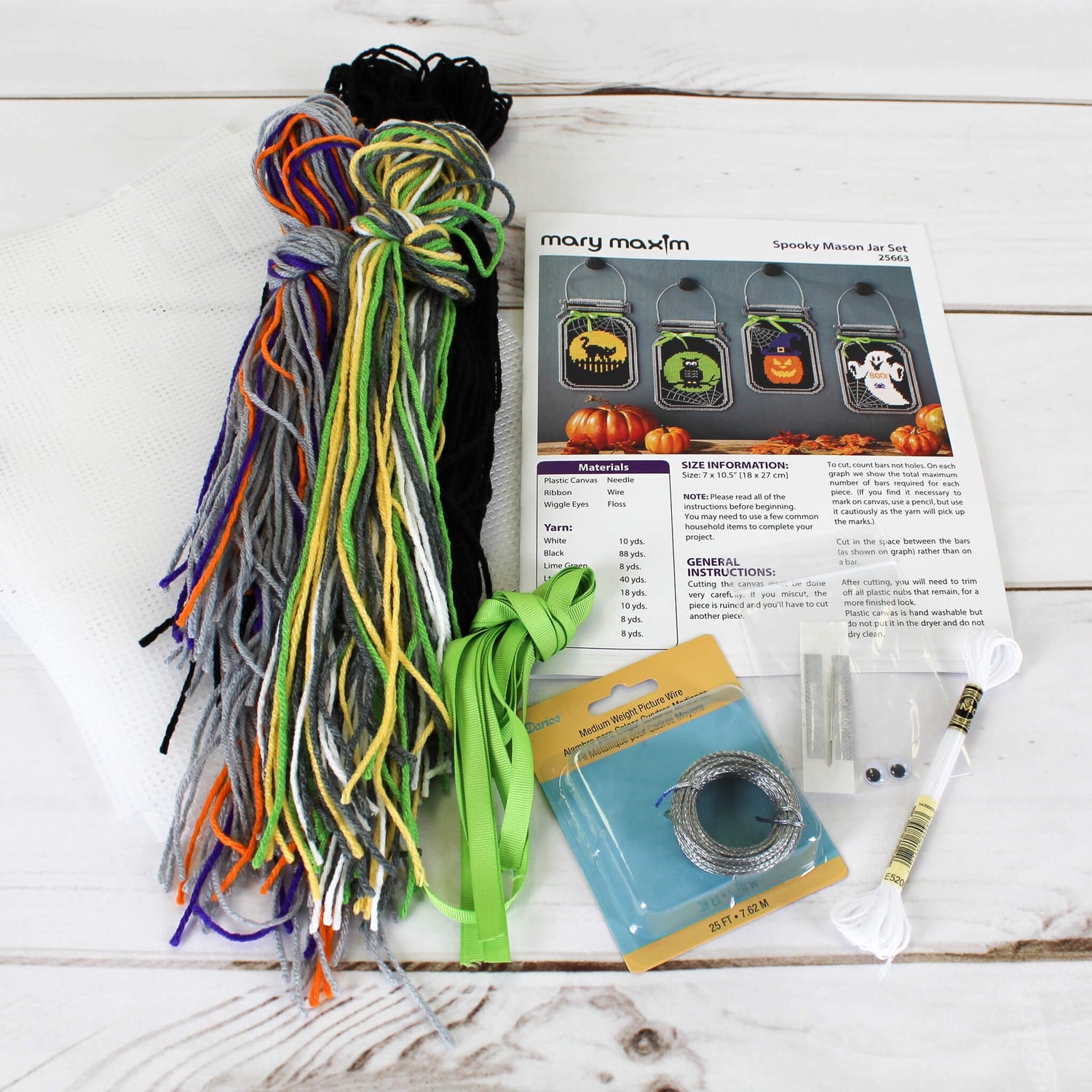 Dé la bienvenida a sus asistentes a pedir dulces con un espeluznante juego de tarros de lona de plástico. ¡Genial para colgar en la pared o para regalar! El kit incluye lienzo de plástico de 7 mallas, hilo acrílico y patrón. La cinta puede variar. Tamaño 7,5 x 10".