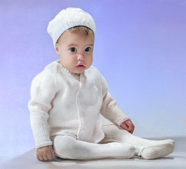Tricotez ce blazer et ce tam classiques en utilisant notre patron vintage. Tricoté à l'origine avec le fil Mary Maxim Starlette en 1960, qui offrait à l'époque 280 mètres par écheveau de 4 oz. Choisissez parmi notre sélection de couleurs tendance de fils peignés en ligne. Gardez à l’esprit : ce métrage a changé. Des aiguilles à tricoter de taille US 3 (3,25 mm) et 6 (4 mm) sont également nécessaires. Tailles 12-18-24 mois, patron inclus.
