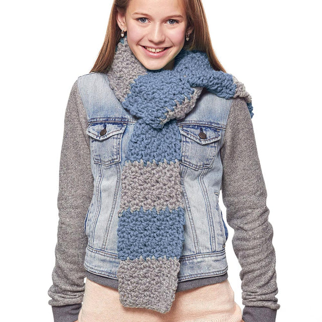 Crochet this easy scarf using Red Heart Super Easy yarn. Requires 1 ball each of 2 colors and crochet hook L-11 (8 mm). Size 6" x 60" Easy crochet.