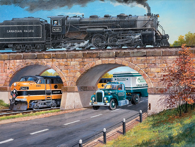 Embark on a cross-country adventure with this vibrant 1000-piece jigsaw puzzle! Watch as trains thunder down the tracks, trucks roll along the highway, and the landscape unfolds piece by piece. Perfect for puzzle enthusiasts who love transportation themes and scenic journeys, this 27 x 20" puzzle delivers hours of engaging entertainment. Whether you're a seasoned puzzler or looking for a fun family activity, this charming scene captures the excitement of travel and exploration. Frame it when finished—it's too good to hide away!