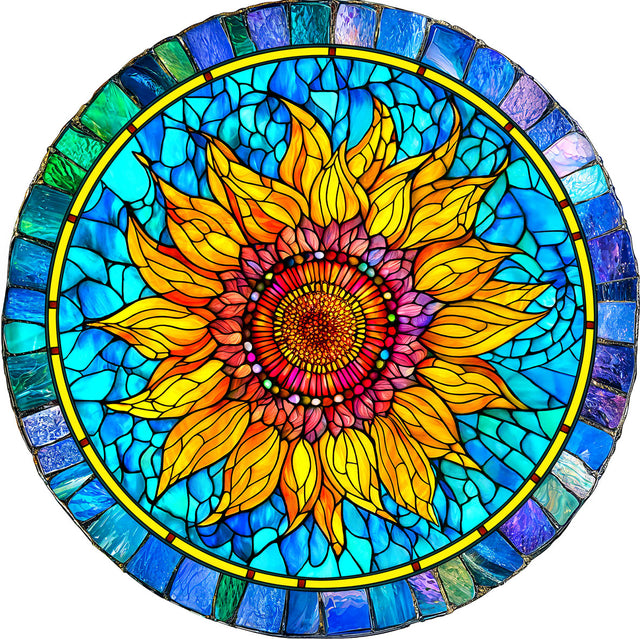 Dive into the colorful world of the Sunflower Mandala Jigsaw Puzzle! This round, 19.5-inch puzzle features 500 pieces that come together to form a vibrant stained glass sunflower design. Perfect for a joyful challenge, it brings a burst of sunshine and fun to your puzzle time, making every piece a happy discovery.