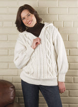 Style aran classique dans cette veste zippée câblée confortable. Vous serez heureux par temps de pull, rien que de porter ceci ! Comprend le poids peigné, Aran Irish Twist ou Aran Irish Tweed et le motif. Fermetures éclair vendues séparément.