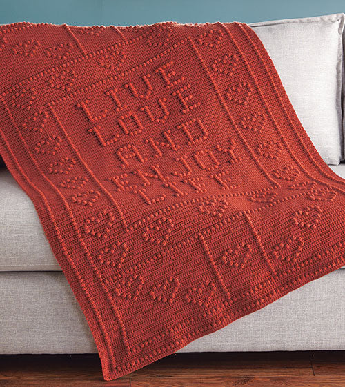 Notre gagnant de la 2ème place ! Conçu par Nancy Liggins. De vraies paroles à vivre entourées de cœurs. Le kit à crocheter comprend le fil et le motif Mary Maxim Starlette. Taille finie 40" (101,6 cm) x 58" (147,32 cm). Nécessite un crochet G-6 (4 mm)