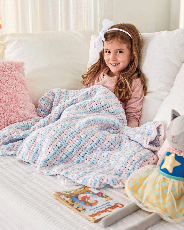 Keep your little one warm with this cushie blanket. Kit includes Premier Pixie Dust Brights yarn and pattern. Requires crochet hook I-9. Size 40 x 40". Intermediate Crochet.