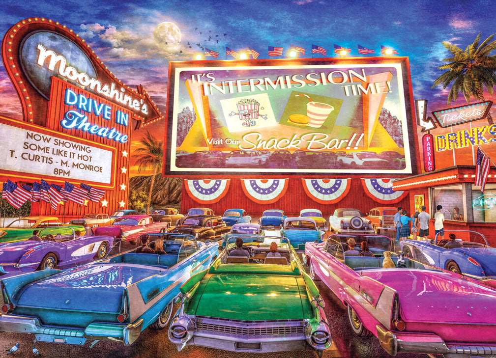 Step back in time with this charming 1000-piece jigsaw puzzle featuring a nostalgic drive-in movie scene. Watch classic cars pull up to the screen as the iconic intermission countdown glows above, capturing that golden age of American entertainment. Perfect for puzzle enthusiasts who love retro vibes and movie magic, this 26.5" x 19" puzzle delivers hours of fun while you piece together memories of simpler times. Whether you're a vintage collector or just craving some wholesome nostalgia, this puzzle is your ticket to a night at the drive-in—no popcorn required!