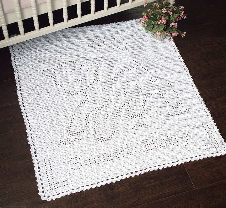 Sweet Baby Lamb. Snuggle baby with this delightfully soft blanket. Kit includes Mary Maxim Twinkle yarn and graph style pattern. Shown in White. Finished: 33 x 38” [84 x 96.5 cm]. Requires Crochet Hook Size E-4 (3.50 mm).