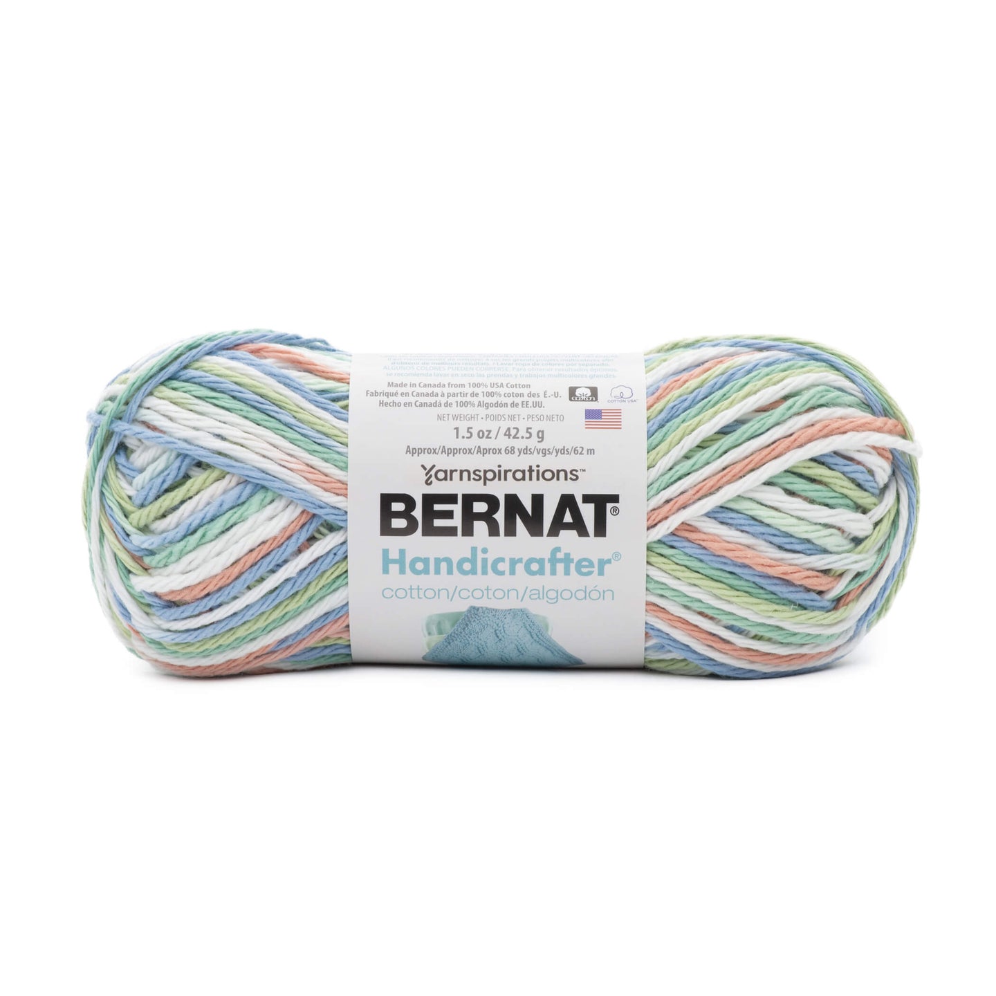 Bernat Handicrafter worsted weight yarn is a natural, soft absorbent 100% cotton yarn. Great for knitting and crocheting those home accessories. Solids: 84 yards per 1.75 oz. ball. Ombres & Prints: 71 yards per 1.5 oz. ball. Suggested gauge: 20 sts. and 26 rows to 4" on size 7 needles.