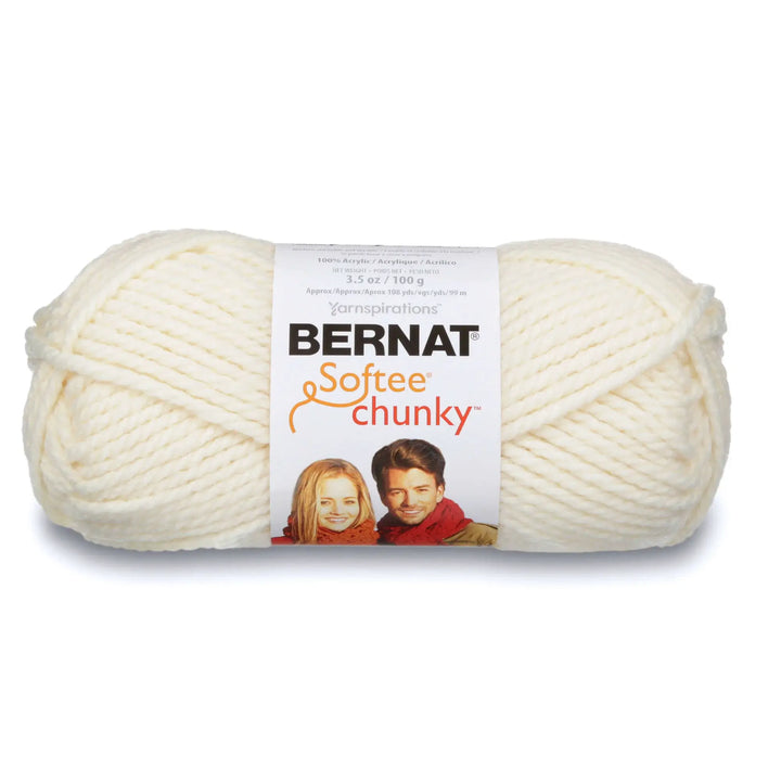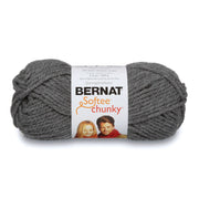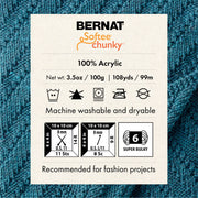 Bernat Softee Chunky Yarn is a full and round 6 ply 100% acrylic fiber that knits and crochets smoothly off the needles and crochet hook. The bulky gauge works up quickly with excellent stitch definition creating a clean and professional finished project whether you want to knit a quick and easy blanket or a fashion-forward cowl for winter. From neutrals to brights, this super bulky weight yarn is available in a range of solid and multi colored shades.