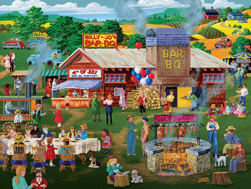 Get your BBQ fix without the mess with Billy-Jo's BBQ Jigsaw Puzzle! This 300 piece puzzle features a charming BBQ joint and people enjoying their meals outside. At 24 x 18", it's the perfect size for some relaxing puzzling. Don't worry, no grilling experience required!