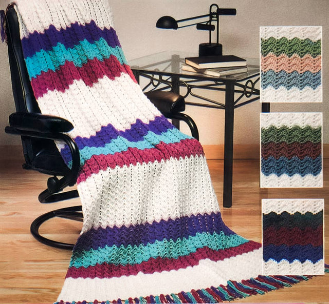 Crochet this afghan with our pattern. Originally created using Bernat Kashmere a worsted weight yarn that offered 142 yds per skein at the time. With a wide variety of worsted-weight yarns and top-quality brands like Mary Maxim Starlette (180 yds per skein) to choose from, you can easily personalize it to match your home decor. Keep in mind yardages vary. Materials List: White (9 skeins), Magenta (3), Aqua (3), Purple (3), and crochet hook size U.S. I/9 (5.50 mm). Finished size 48 x 67.5 " (122 x 173 cm). Intermediate crochet