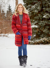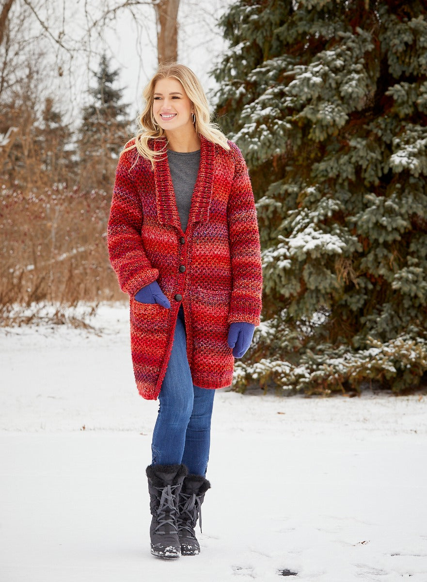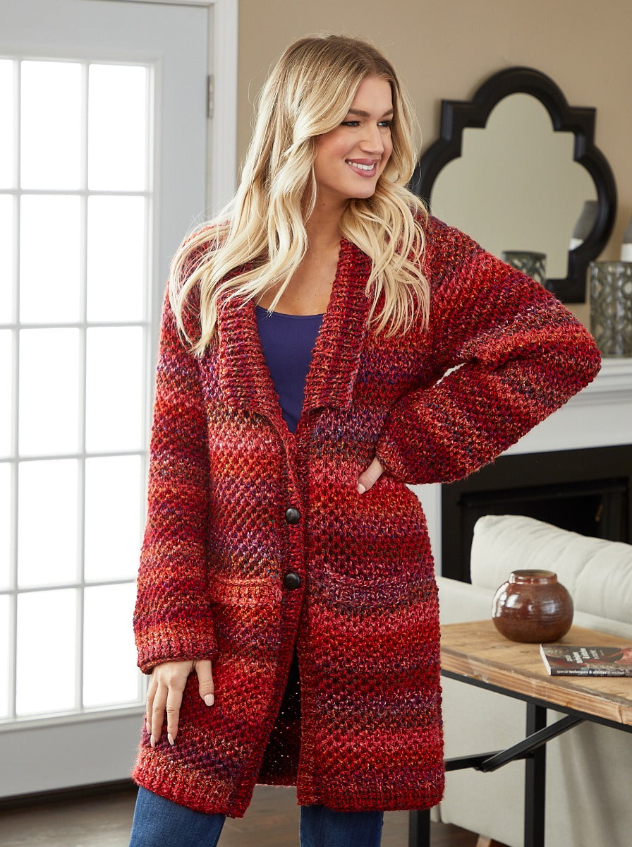 Wrap yourself in warmth with this super soft, long cardigan featuring a shawl like collar and optional three button closure. For the intermediate knitter, this Chunky Textured Cardigan kit includes Mary Maxim Marvelous Chunky 100% acrylic bulky weight yarn and pattern. Buttons not included. Requires 32" Circular Needle size 11.