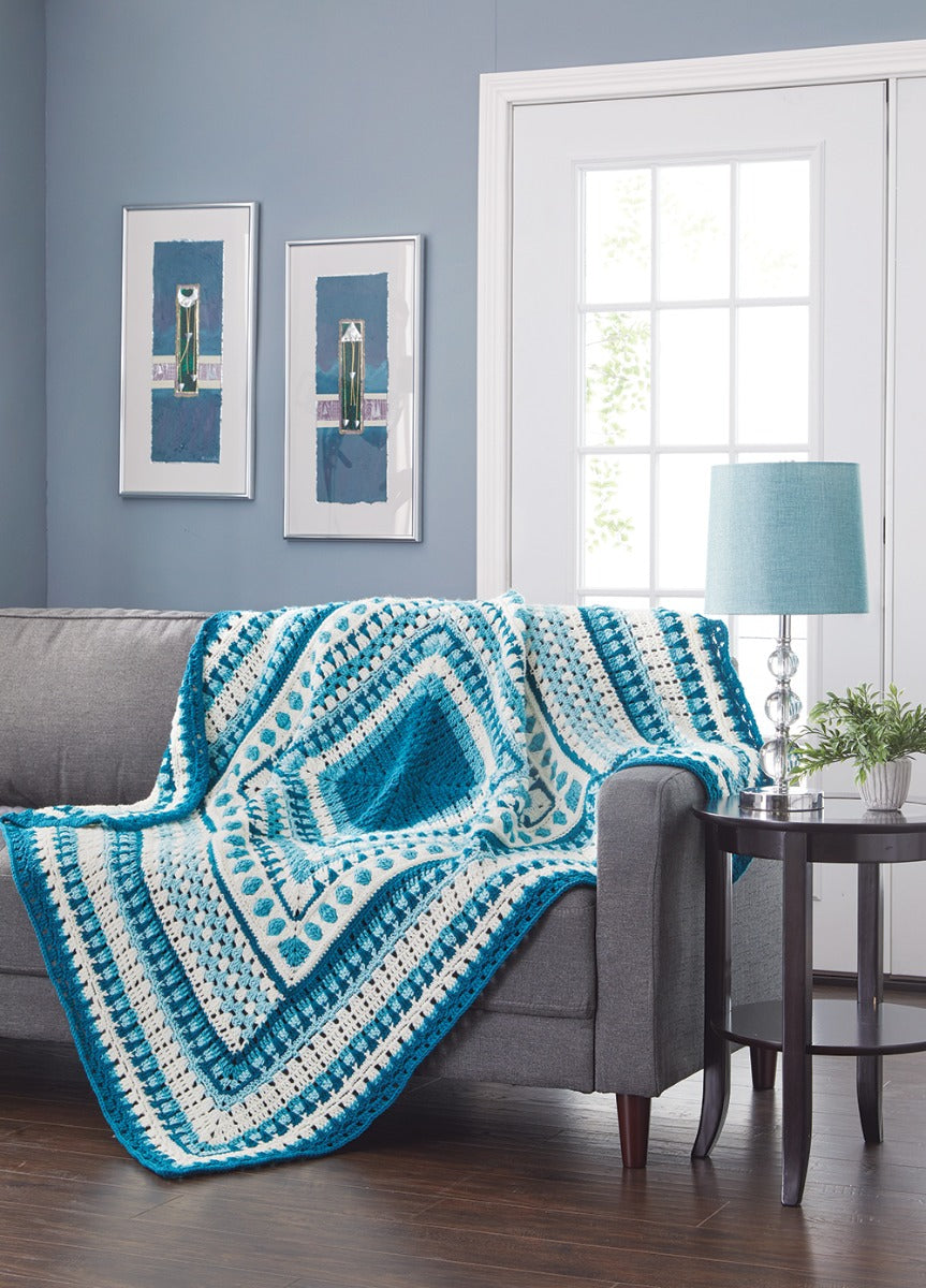 The pattern begins with a classic granny square with the difference of cluster stitches on either side of corners and chain spaces making a modern granny that stands out from the crowd. As you continue working more rounds, colors are added that make the design show up even more. The row of diamond shapes looks like separate squares that are sewn together, but are worked in rounds as you continue the pattern. Bands of stripes, shown in the model in the two lightest colors, are added at opposite ends to increase the length and change the design from a square to a rectangle. More rounds are added, repeating design elements from earlier in the pattern, to complete the generous 48.5 x 60.5" afghan. Requires crochet hook I-9.