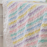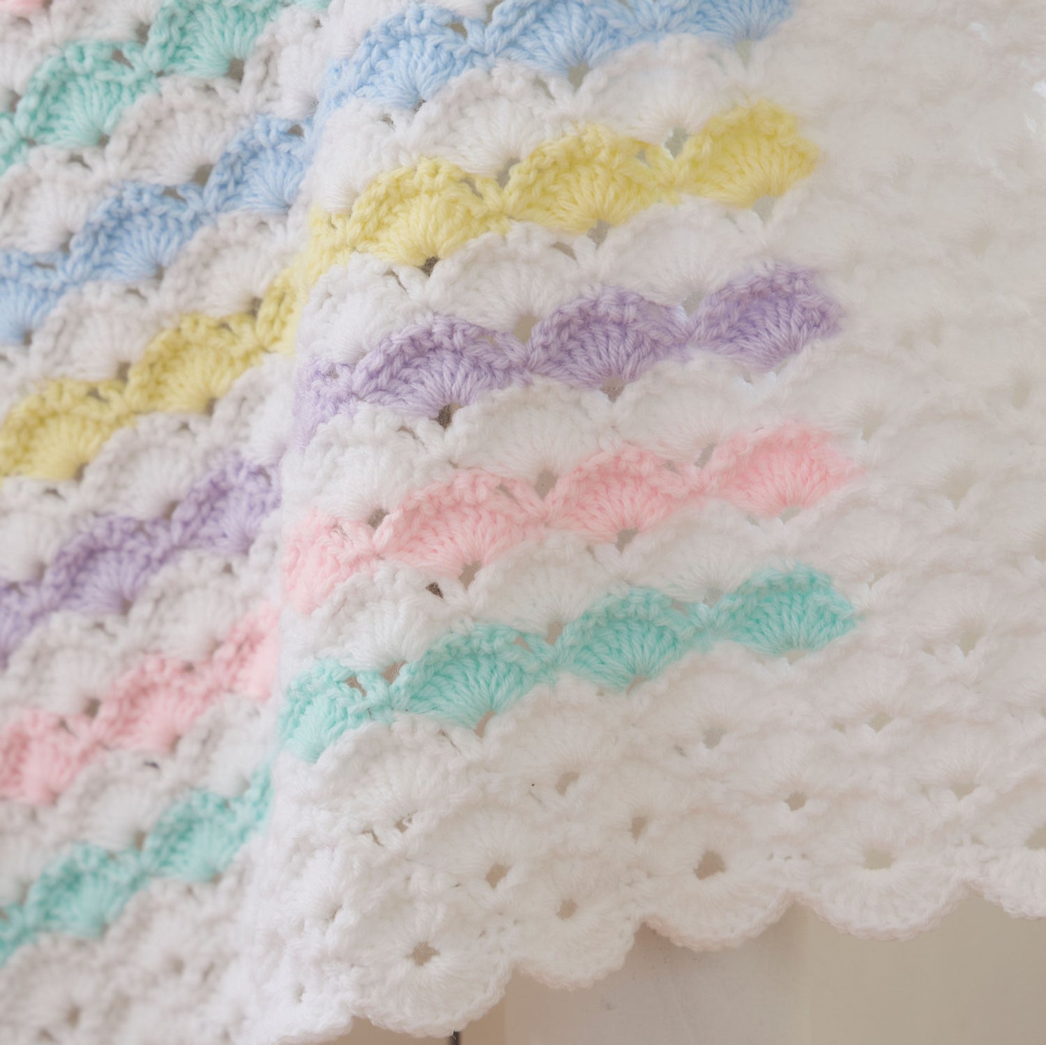 Rainbow shells frames in white and worked all in one piece. Kit includes Mary Maxim Twinkle yarn and pattern. Requires crochet hook D-3 (3.25 mm). Size 32" x 36". Intermediate Crochet.
