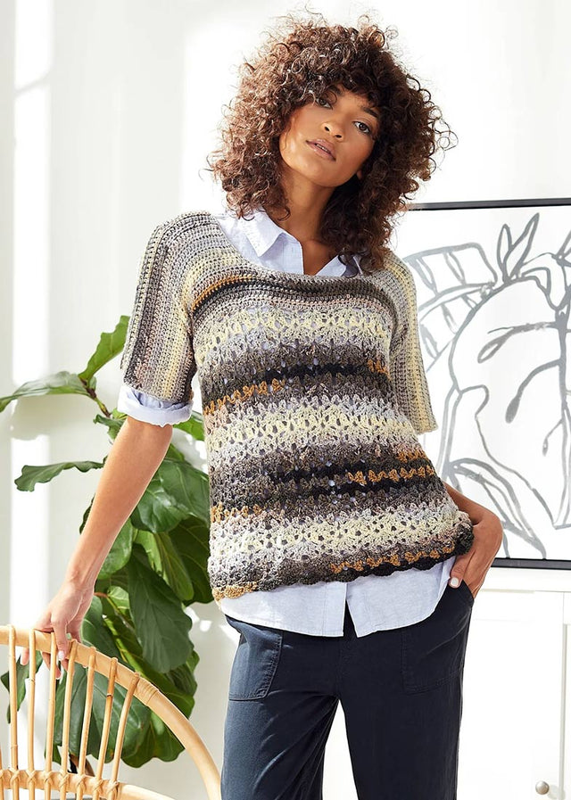 Requires 3 (4, 4, 5, 5, 6, 7, 7) Skeins of Premier Colorfusion DK Yarn. Shown in Morning Coffee (Not Available).Free Autumn Lace Top is backordered and your entire order will ship as soon as it is back in stock.