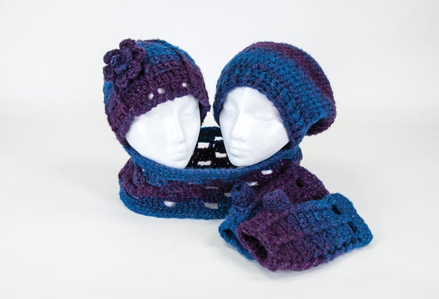 Bundle up with style using this versatile winter pattern collection! Master three cozy projects in one: a chic cloche hat and matching mitts, a relaxed slouchy beanie, and a snug cowl. Perfect for crafters looking to expand their cold-weather wardrobe with multiple must-have accessories. Designed for the Mary Maxim Crochet Club in 2017, and using 4 skeins of a bulky weight yarn, Rozetti Allore that provided 109 yds per 1.75 oz at the time, and crochet hook size J/10 (6 mm). Shop our entire selection of bulky yarns for that perfect substitute. Just keep in mind yardages will vary between brands. Hat circumference 20" (51 cm), Cowl 6 x 32" (15 x 81.5 cm) and mitts 9" (23 cm) long. Intermediate crochet.