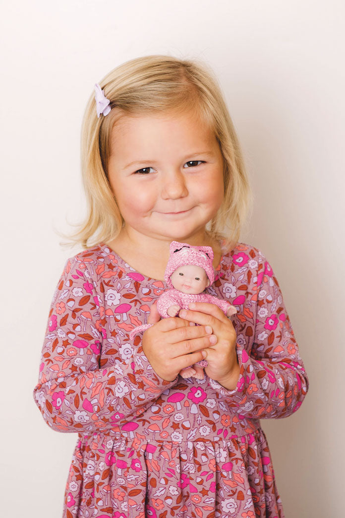 An adorable set for your little one. Kit includes Mary Maxim Starlette and Twinkle yarns, one 5" doll and pattern to make both purse and doll outfit. Requires crochet hooks C-2 (2.75 mm) and H-8 (5 mm). Bag size 7 x 5 x 3". Intermediate Crochet.